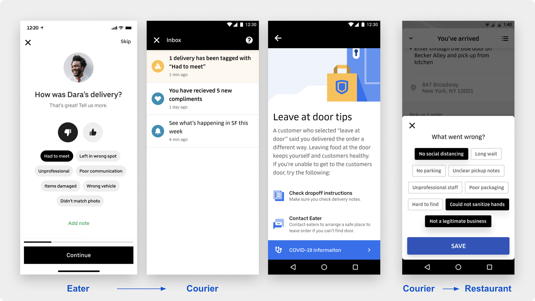 To ensure compliance with government-mandated COVID-19 protocols, I developed a feedback loop that allowed eaters, couriers, and restaurants to report and address health concerns.