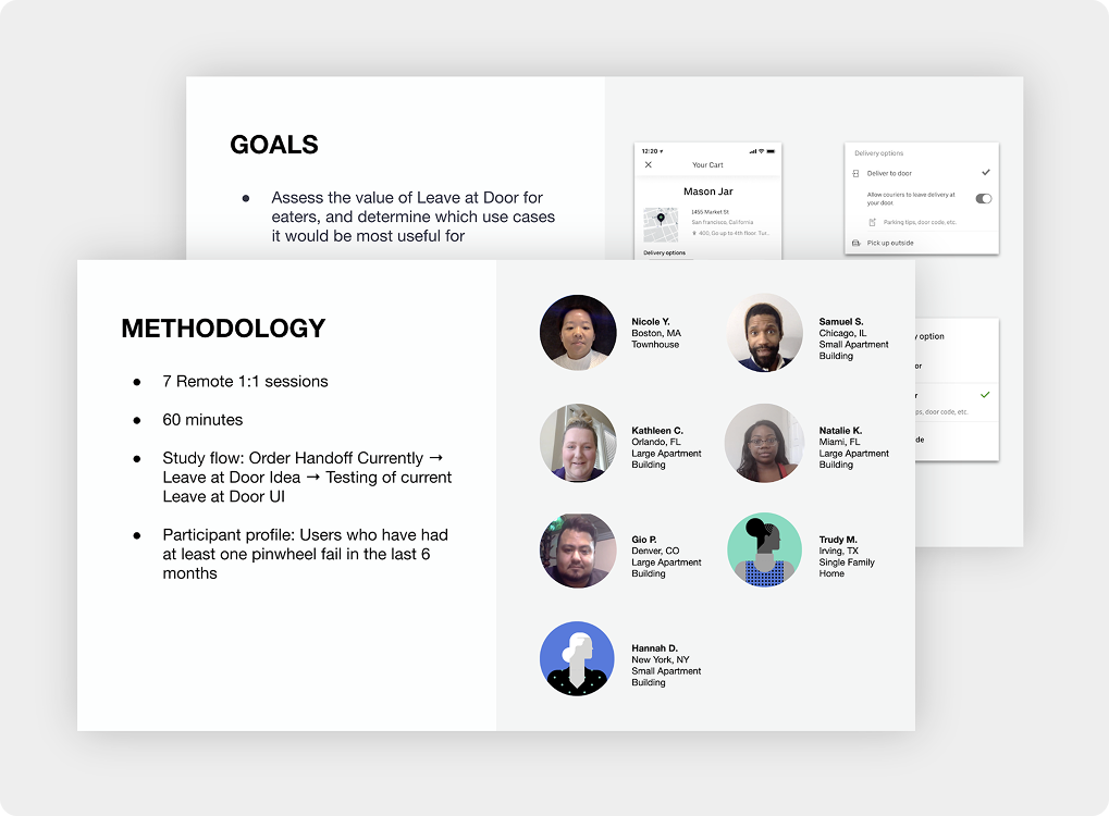 I collaborated with two researchers—one focused on Eaters, the other on Couriers—and partnered with the product manager to define research goals. I outlined key product questions that shaped interview plans and scripts.